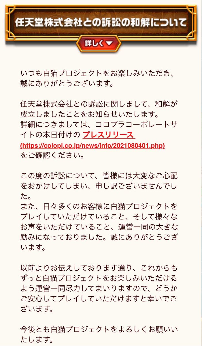 @tatamin02私たちの青春を費やした白猫プロジェクトのゲーム会社コロプラとニンテンドーが和解したとのことです、