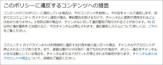 違反した場合はコンテンツが削除され、その旨が通知されます。2回目移行はチャンネルに対して違反警告が発行され、90日以内に3回目の違反警告を受けるとチャンネルは停止されるとのこと。